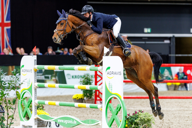 02.11.2025 Sieben Paare erreichten das entscheidende Stechen im Großen Preis von Oldenburg, der Sonntagnachmittag wurde zu einer sehr spannenden Angelegenheit zum Abschluss des AGRAVIS-Cups 2025. Denn schon das erste Paar Carsten-Otto Nagel (RFV Stall Moorhof) mit Curacao eröffnete das Finale fehlerfrei und flott (37,11 Sekunden). Auch wenn der 14-jährige Wallach mit den angekündigten Siebenmeilenstiefeln durch den Parcours gejagt war, es sollte „nur“ zum dritten Platz reichen.